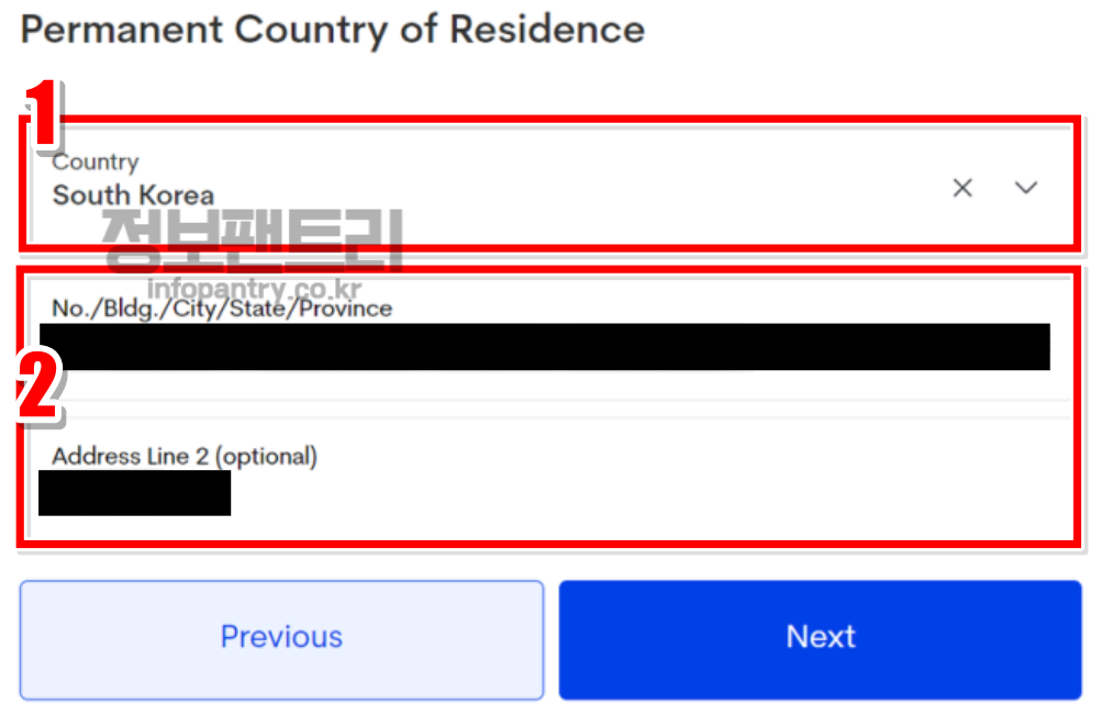 1. 거주국가를 선택하세요. South Korea로 선택하시면 됩니다.